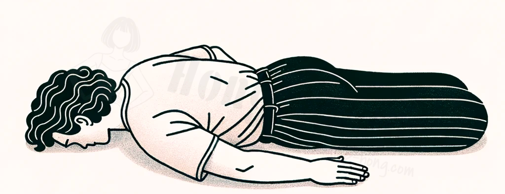 - 매트에 엎드려 양손을 포개어 바닥에 대 주고, 이마를 손 등 위에 올려 준다.